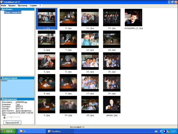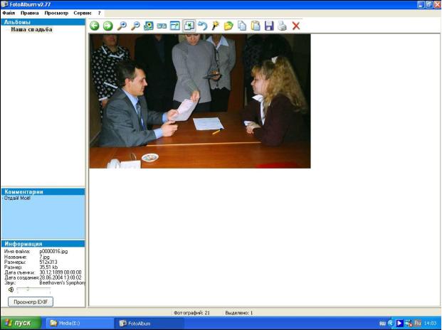 При заказе услуг на сумму 500 рублей, Вы получаете бесплатно цифровой фотоальбом, который будет находиться на CD диске, его можно будет посмотреть на любом компьютере. Программа фотоальбома очень проста и удобна в использовании. Открыв ее вы увидите окно примерно такого содержания: