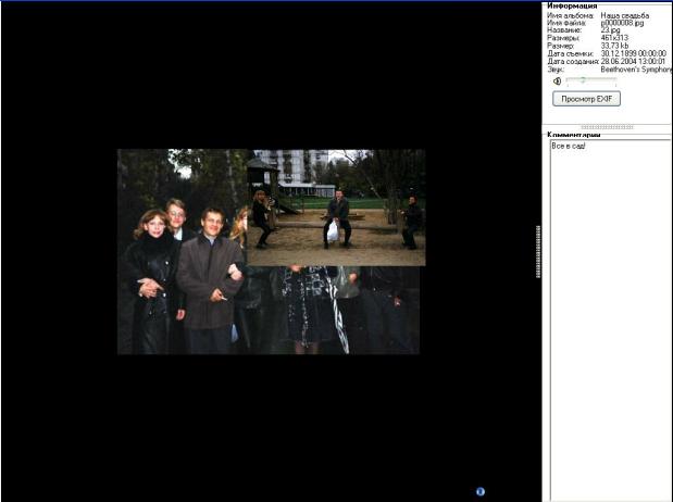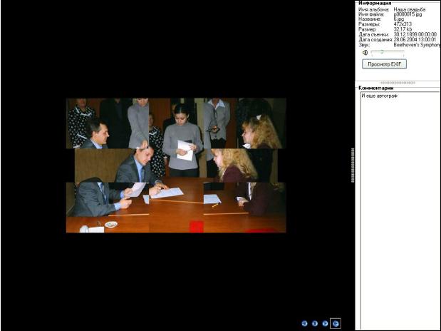 Вы увидите все фотографии альбома, которые будут сменять друг друга через заданное количество секунд, все это может сопровождаться Вашей любимой мелодией. Фотографии сменяют одна другую с различными эффектами. Справа отбражаются Ваши комментарии к каждой фотографии.